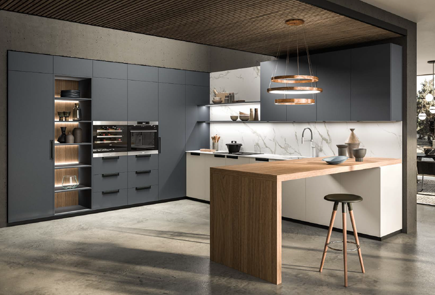 Anta realizzata con pannello in MDF sp 20 mm a bassa emissione di formaldeide (Classe E1) rivestita fronte retro con decorativo in tinta e laccato in finitura trasparente opaca sul lato Anteriore. Bordo ABS opaco in tinta.